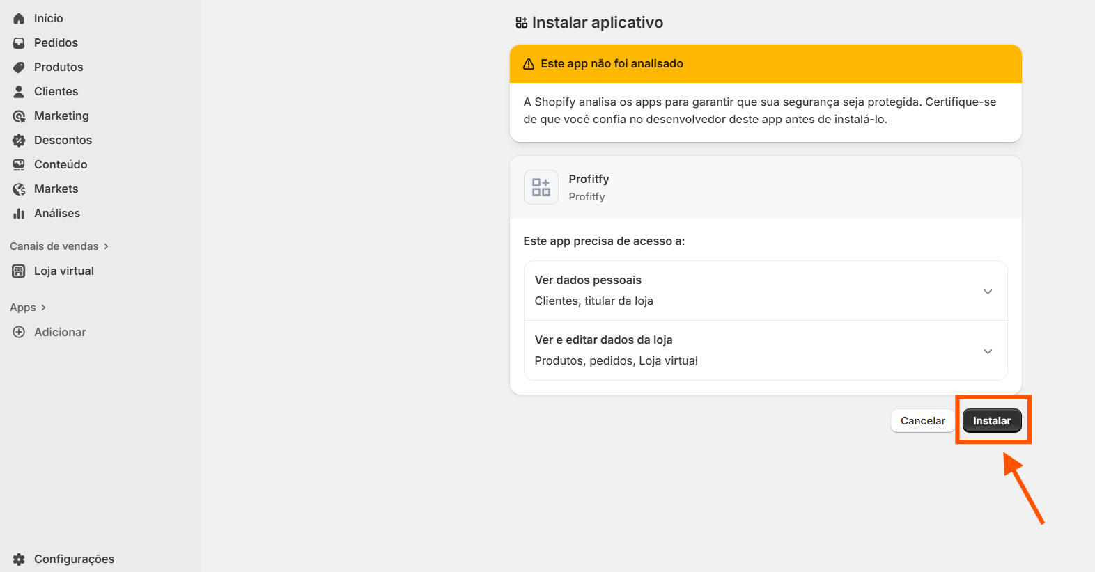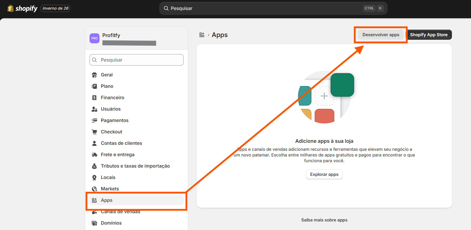 Primeiro é necessário irmos na Shopify, para integrar o app da Profitfy lá