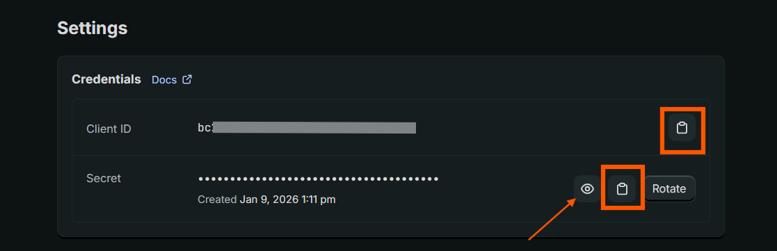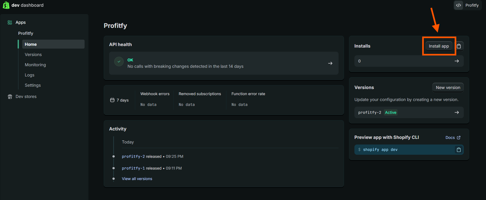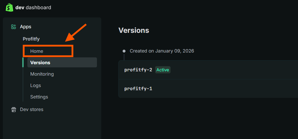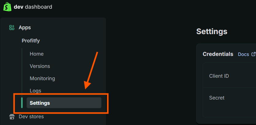 8. Após isso basta voltar para a pagina anterior (dev dashboard) e clicar em Settings. Nessa aba é só copiar o seu Client ID e a Secret para integrar com a Profitfy!