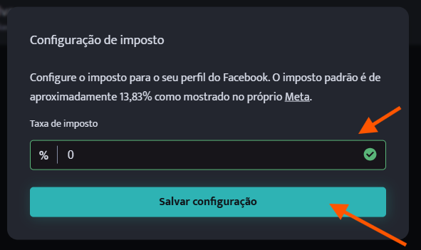 Depois disso, será exibido um pop-up onde você deverá cadastrar a taxa de imposto, que será aplicada a todas as contas de anúncio. Após preencher, clique em Salvar configuração.
