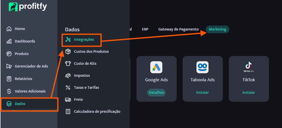Basta acessar o menu lateral esquerdo e clicar em Dados > Integrações > Marketing. Em seguida, selecione Facebook/Meta ou Taboola para iniciar a configuração.