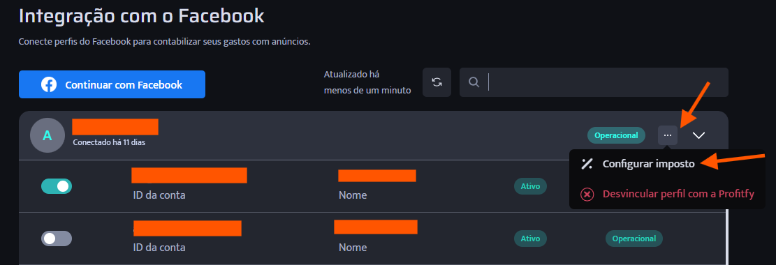 Após selecionar a plataforma desejada, clique nos três pontinhos no lado direito do perfil de anúncio e, em seguida, clique em Configurar imposto.